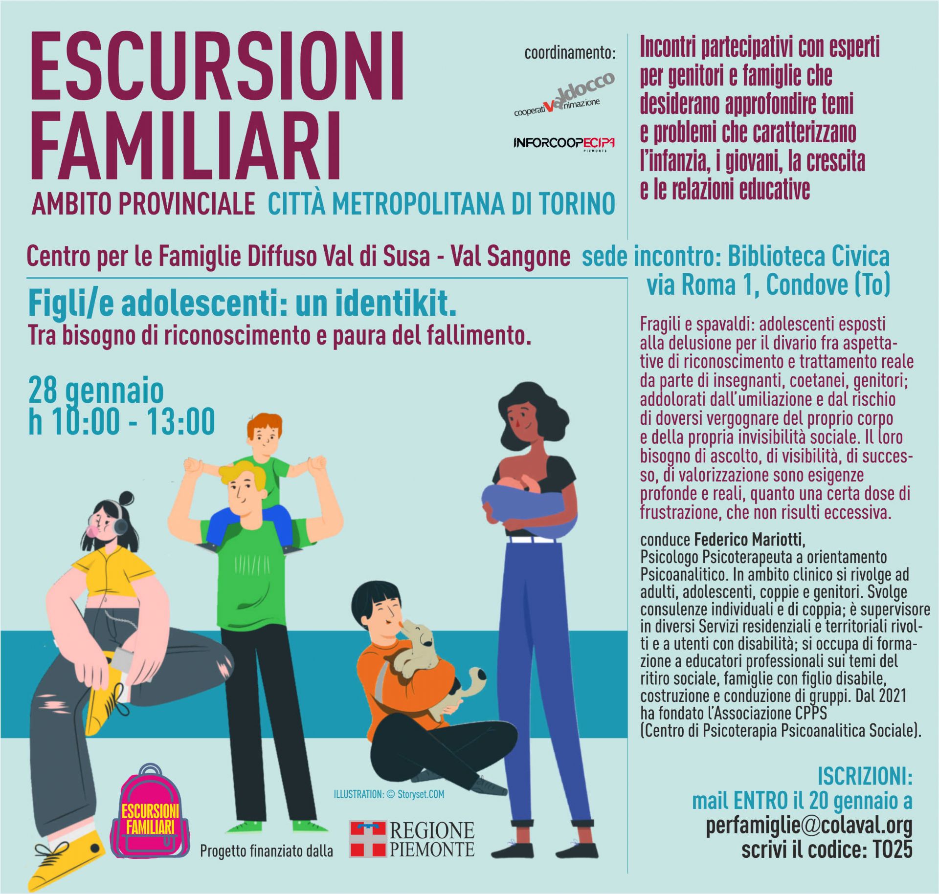 Due incontri laboratoriali, presso la Biblioteca Civica di Condove, con esperti per genitori sui temi che caratterizzano l'adolescenza (28 gennaio) e l'età dello sviluppo (25 febbraio). Trovate tutte le informazioni nelle locandine