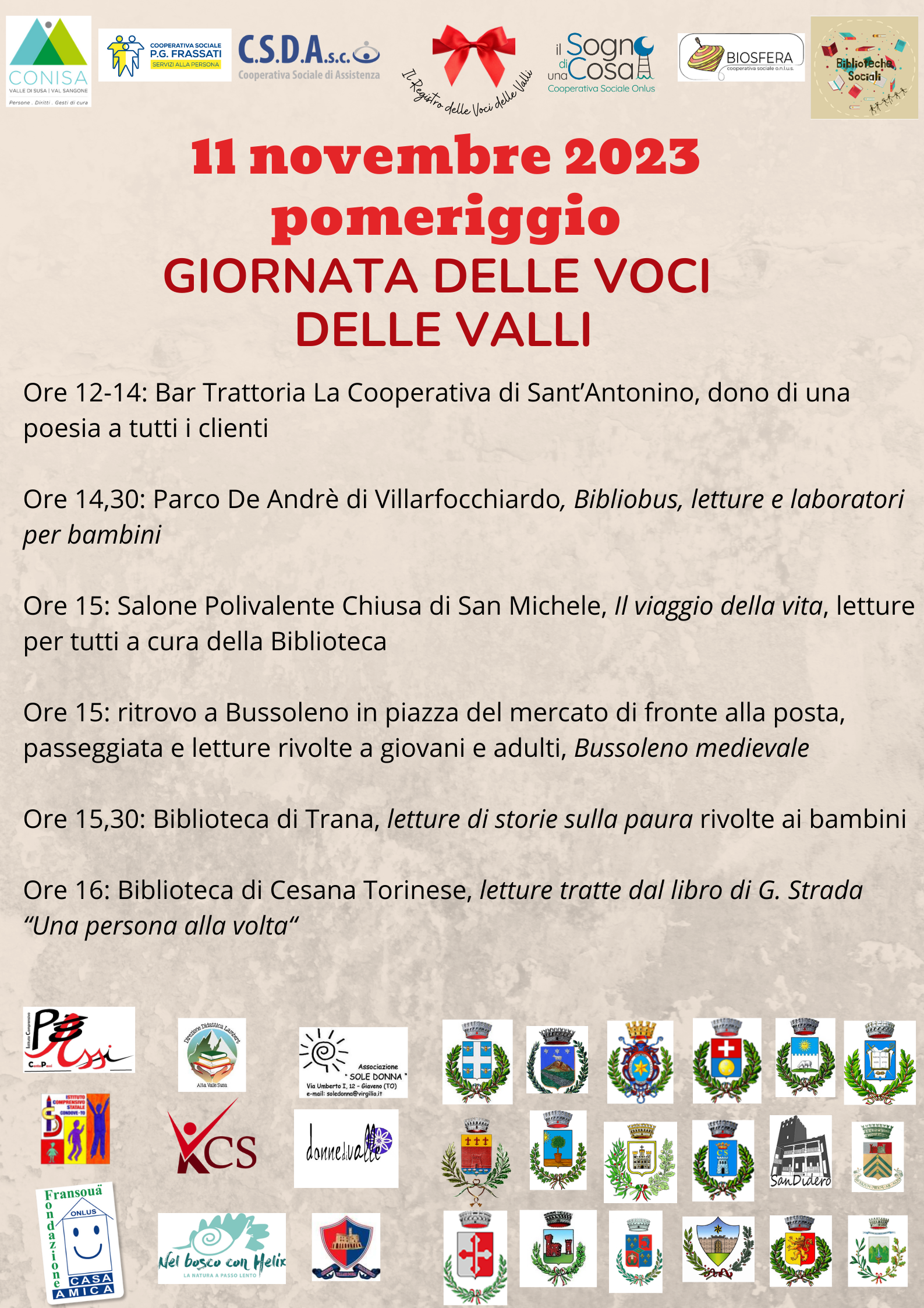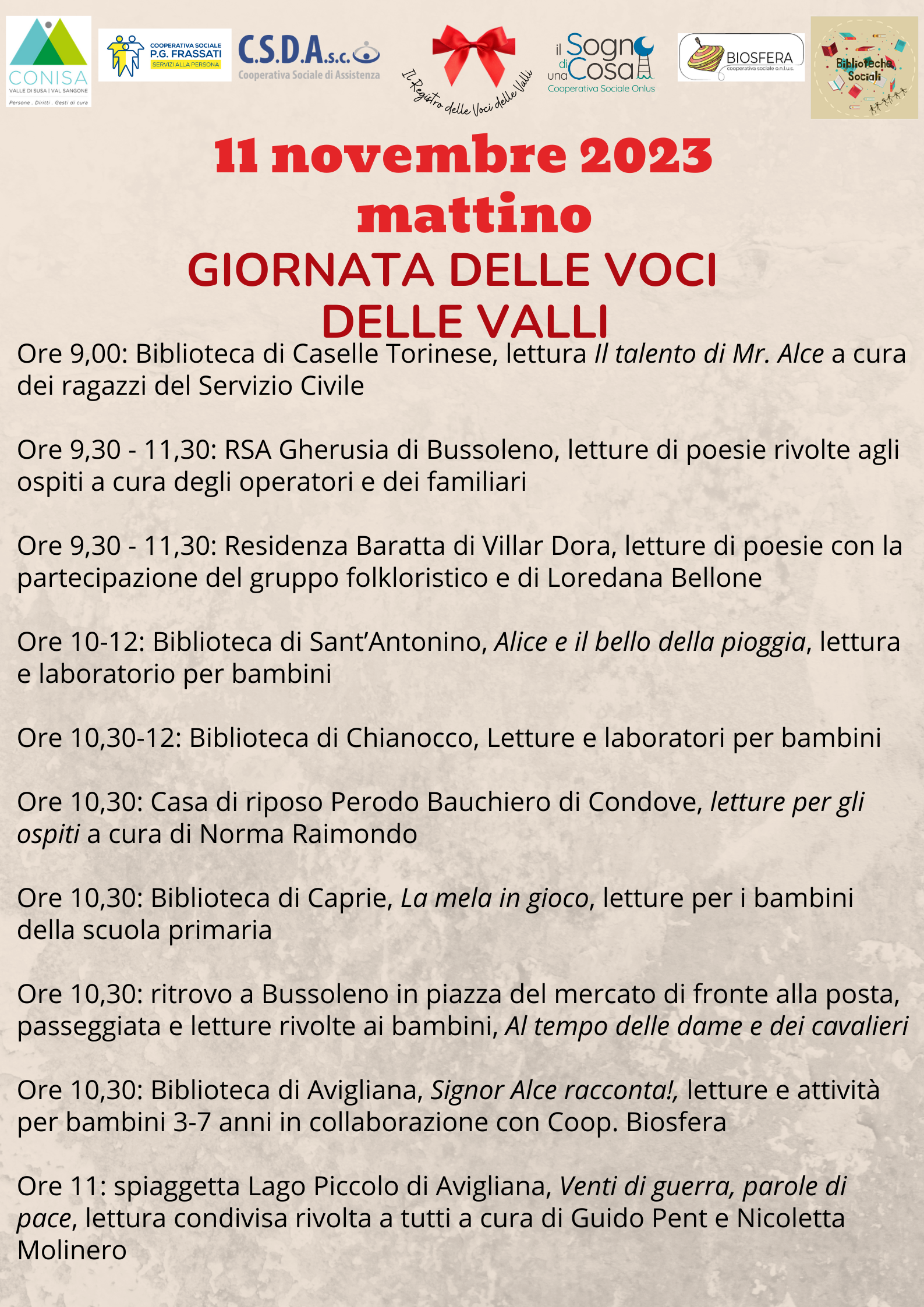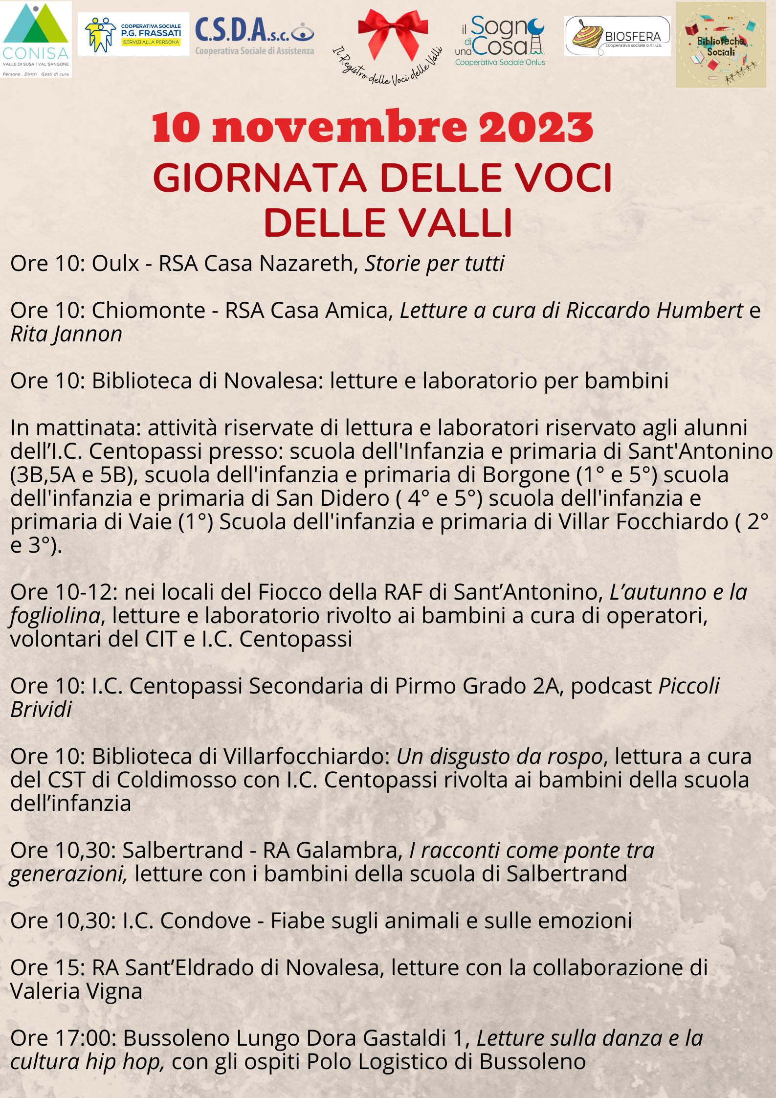 In mattinata: attività riservate di lettura e laboratori riservato agli alunni dell’I.C. Centopassi presso: scuola dell'Infanzia e primaria di Sant'Antonino (3B,5A e 5B), scuola dell'infanzia e primaria di Borgone (1° e 5°) scuola dell'infanzia e primaria di San Didero (4° e 5°) scuola dell'infanzia e primaria di Vaie (1°) Scuola dell'infanzia e primaria di Villar Focchiardo (2° e 3°)