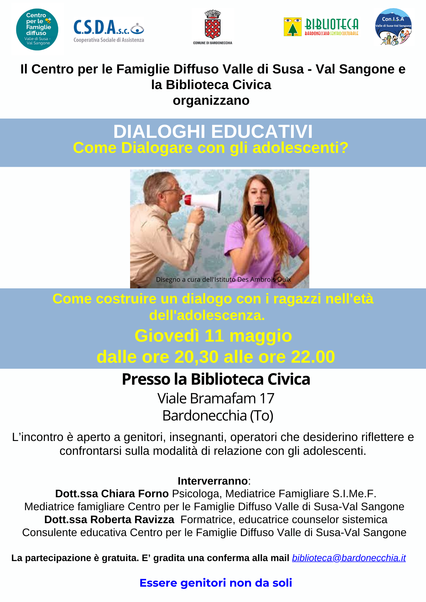 Il Centro per le Famiglie Diffuso Valle di Susa - Val Sangone e la Biblioteca Civica di Bardonecchia organizzano un incontro, giovedì 11 maggio dalle ore 20,30, aperto a genitori, insegnanti, operatori che desiderino riflettere e confrontarsi sulla modalità di relazione con gli adolescenti.