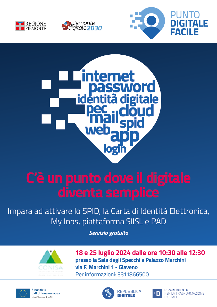 Questo progetto è promosso dal Con.I.S.A. grazie al Bando della Regione Piemonte "Rete dei servizi di facilitazione digitale", finanziato tramite il PNRR – Missione 1 – Asse 1 – Misura 1.7.2.