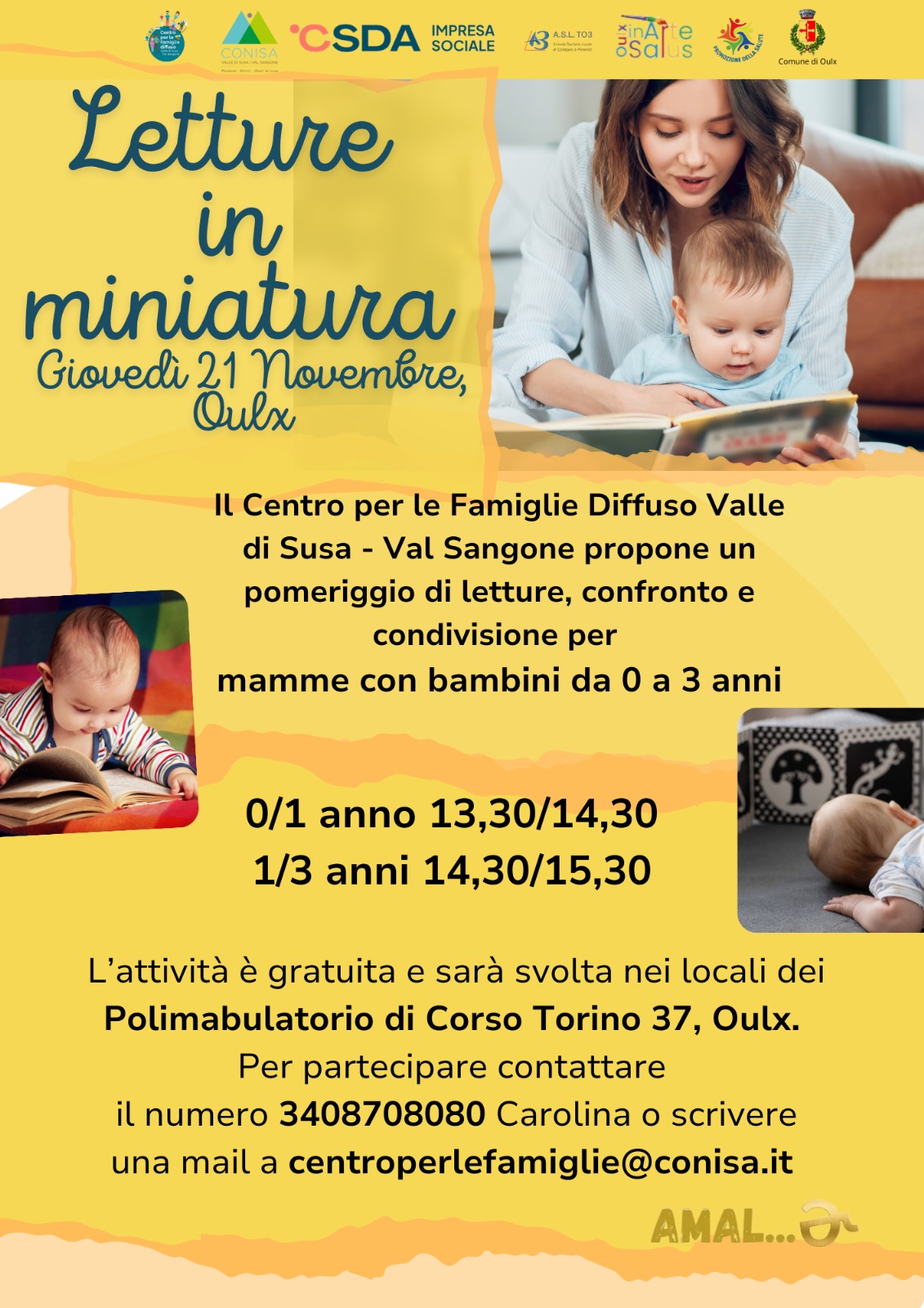 Il Centro per le Famiglie Diffuso Valle di Susa e Val Sangone propone un pomeriggio di letture, confronto e condivisione per mamme con bambini da 0 a 3 anni.
