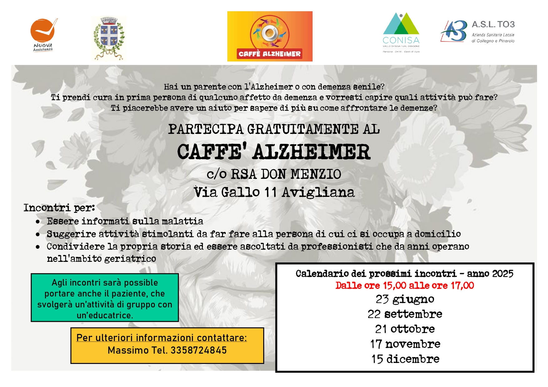 𝐂𝐚𝐟𝐟𝐞̀ 𝐀𝐥𝐳𝐡𝐞𝐢𝐦𝐞𝐫: incontri presso la 𝑹𝑺𝑨 𝑫𝒐𝒏 𝑴𝒆𝒏𝒛𝒊𝒐 di Avigliana.