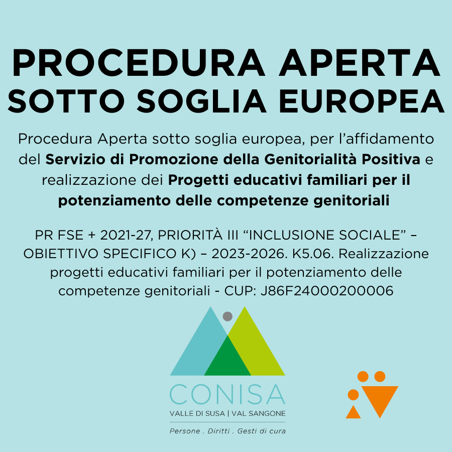 Procedura Aperta sotto soglia europea, per l’affidamento del Servizio di Promozione della Genitorialità Positiva e realizzazione dei progetti educativi familiari per il potenziamento delle competenze genitoriali PR FSE + 2021-27, PRIORITÀ III “INCLUSIONE SOCIALE” – OBIETTIVO SPECIFICO K) – 2023-2026. K5.06. Realizzazione progetti educativi familiari per il potenziamento delle competenze genitoriali - CUP: J86F24000200006
