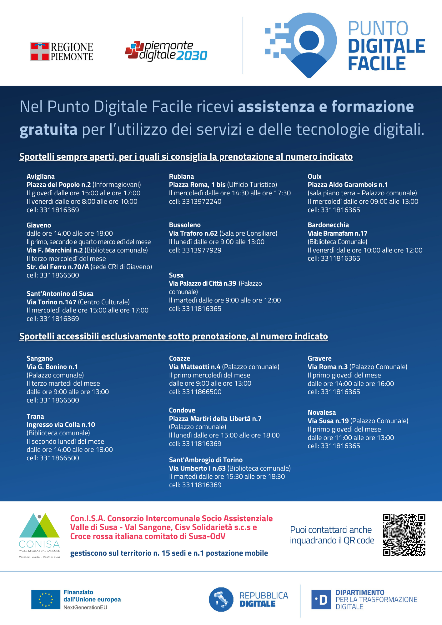 Per rimanere aggiornati sugli orari degli sportelli e sulle prossime opportunità formative, è possibile seguire la pagina facebook “Facilitazione Digitale Valsusa Valsangone”.