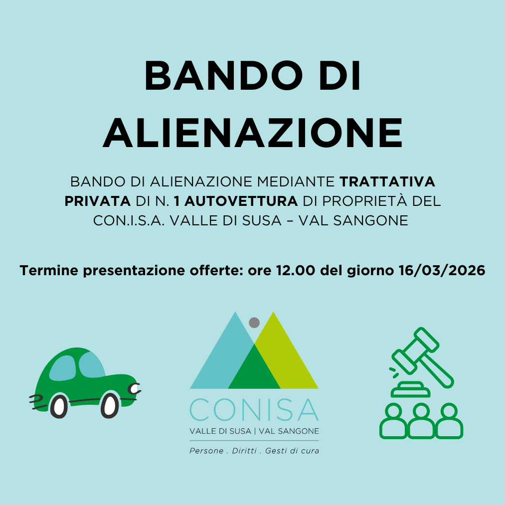 Il Con.I.S.A.Valle di Susa – Val Sangone intende procedere all’alienazione di un'autovettura di proprietà (Fiat Ducato, dotato di pedana elettroidraulica posteriore.), da aggiudicare mediante trattativa privata al rialzo rispetto all’importo posto a base di gara.