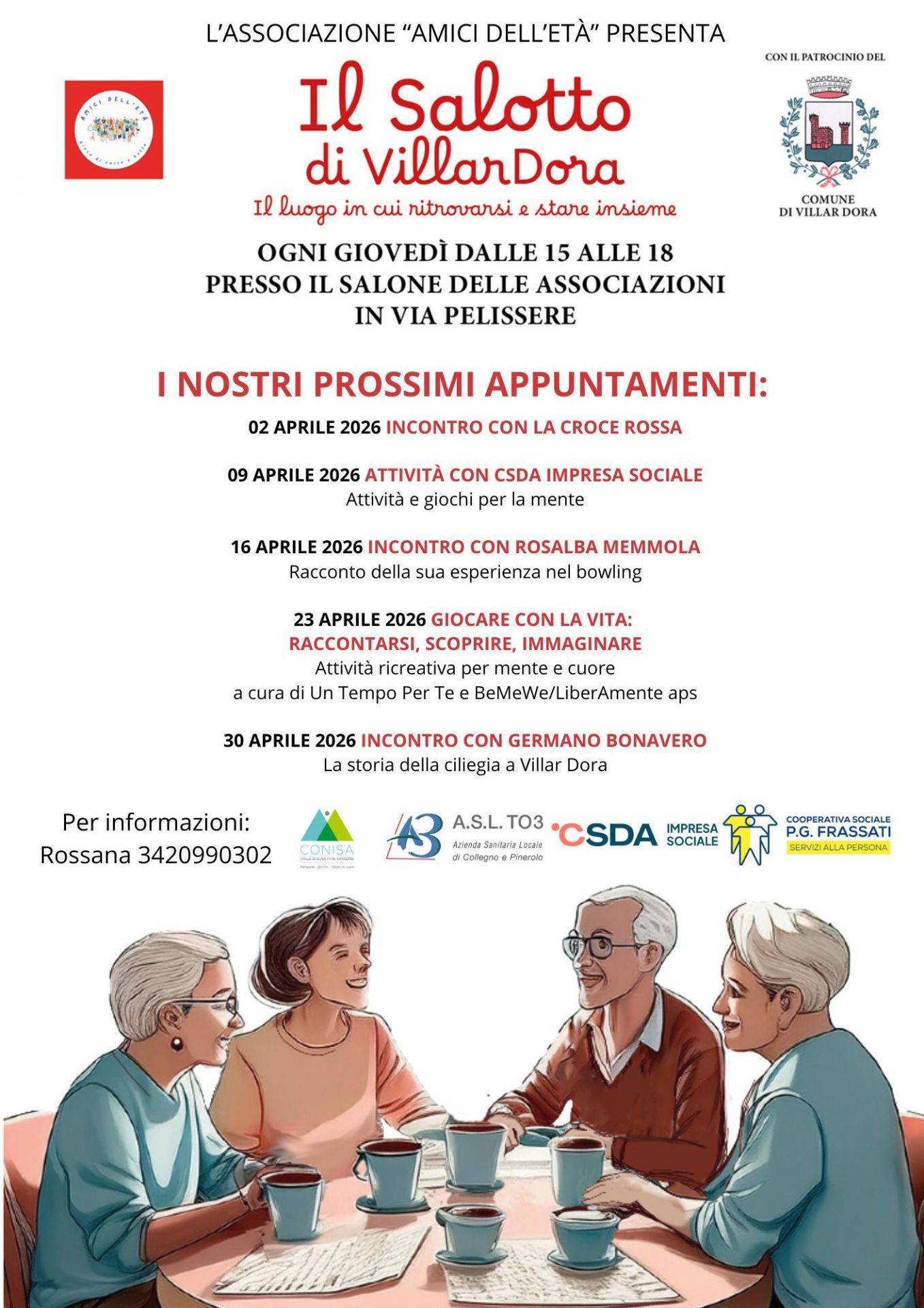 Ogni giovedì dalle 15 alle 18, presso il Salone delle Associazioni - Via Pelissere, vi aspetta Il Salotto di Villardora, un'iniziativa dell'Associazione "Amici dell'Età", con il patrocinio del Comune di Villardora.