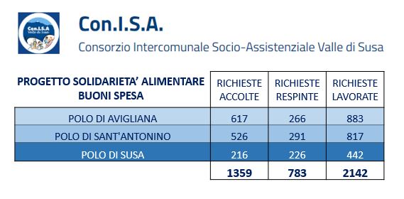 Il Consorzio Intercomunale Socio Assistenziale “Valle di Susa” Con.I.S.A., a seguito di quanto disposto dall’OCDPC n. 658 del 29/03/2020, in collaborazione con le Amministrazione Comunali del territorio si è attivata per soddisfare le necessità dei propri cittadini in stato di bisogno, attraverso l'erogazione di “buoni spesa” per l'acquisto di generi alimentari e prodotti di prima necessità.