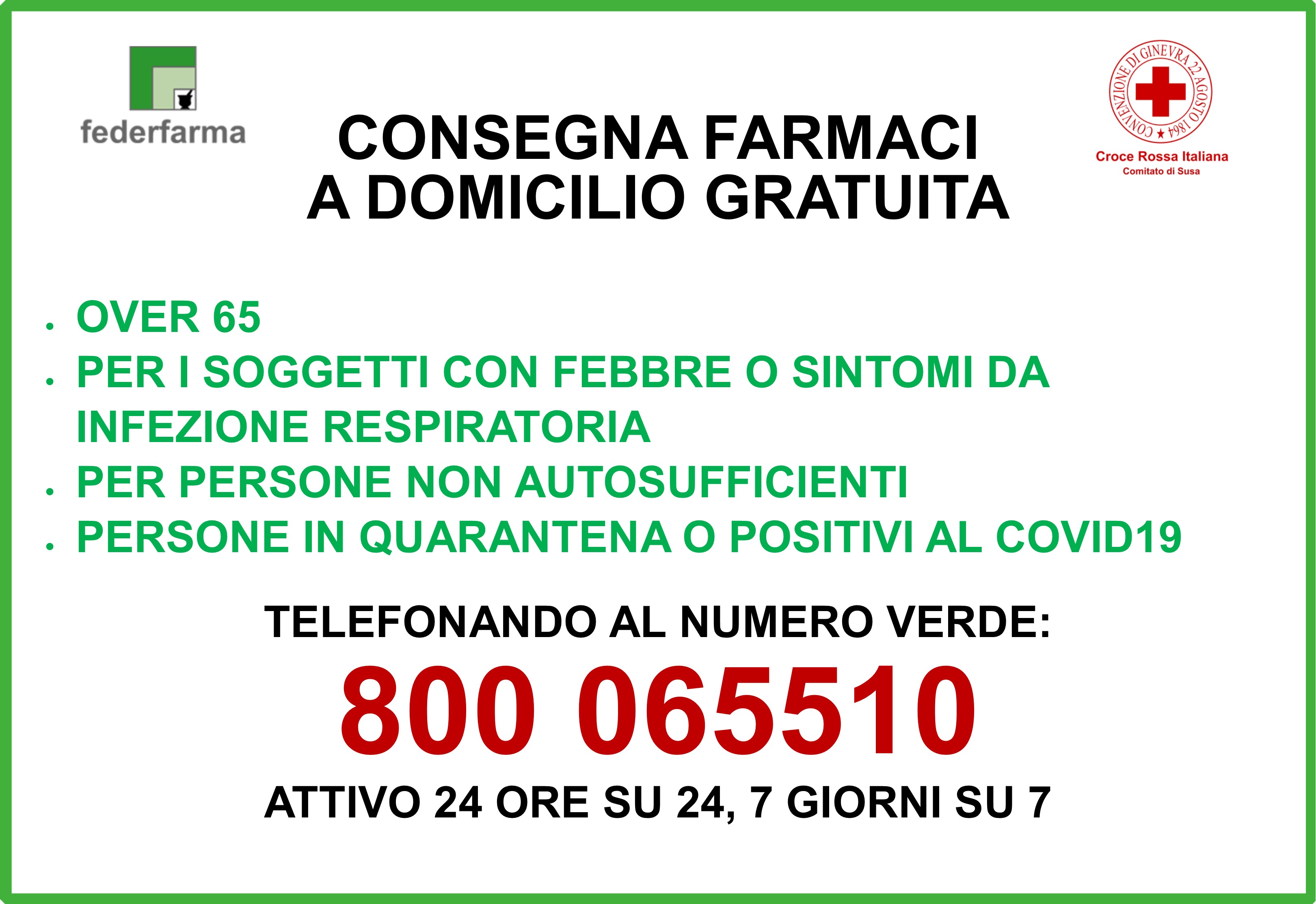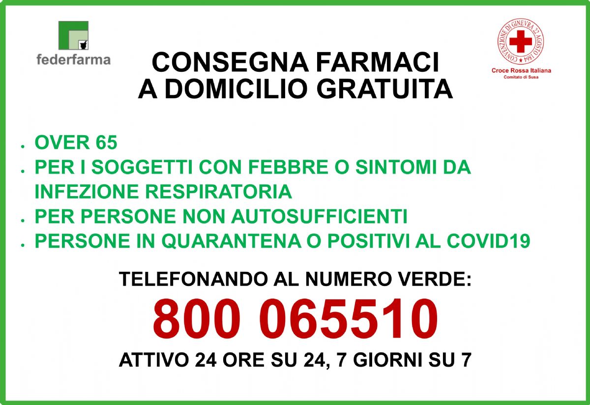 Croce Rossa Italiana in collaborazione con Federfarma ha intensificato il servizio totalmente gratuito di consegna farmaci a domicilio a favore delle persone vulnerabili attraverso il numero verde CRI per le Persone 800 065510, disponibile h24 e sette giorni su sette.