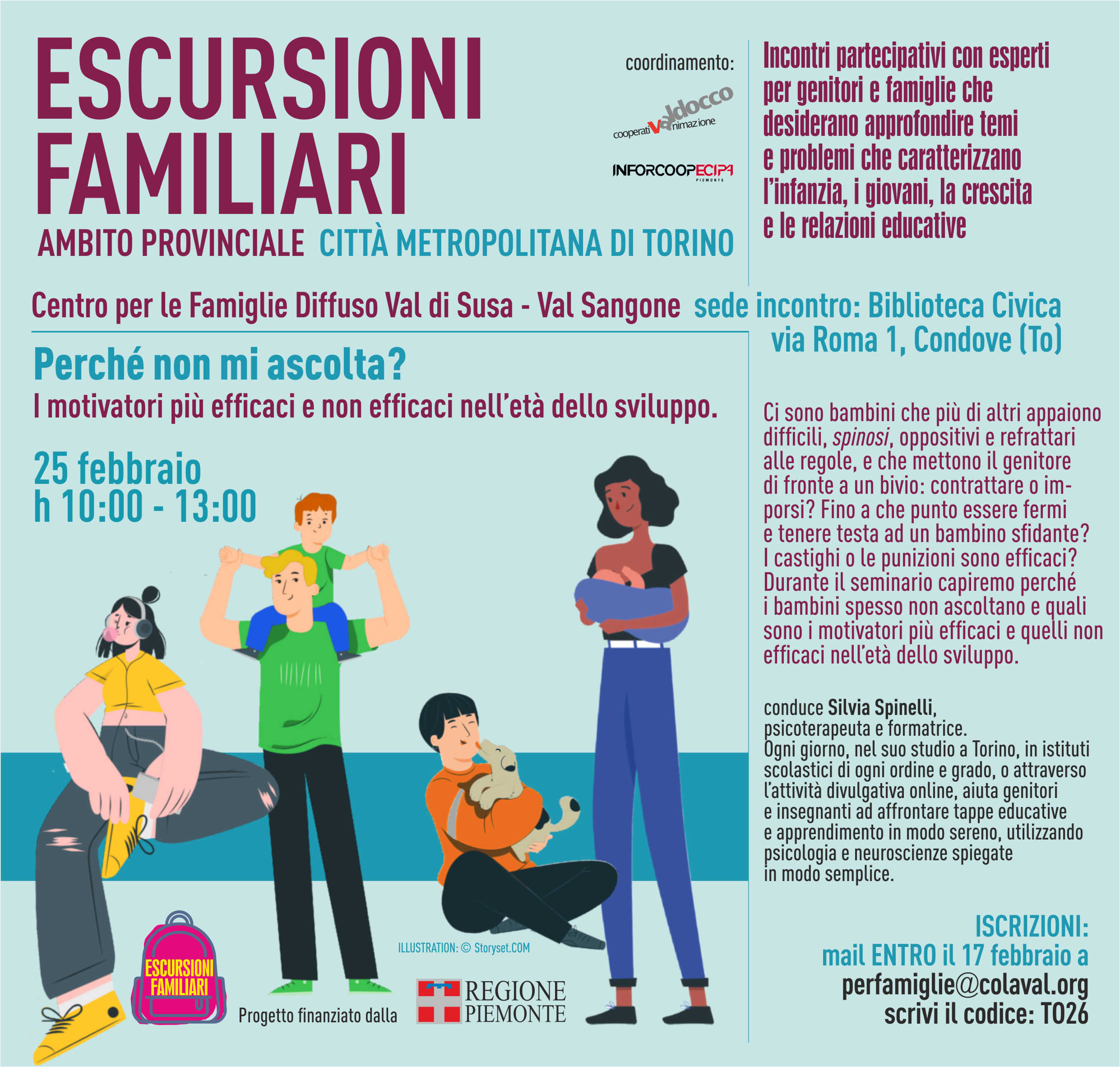 Due incontri laboratoriali, presso la Biblioteca Civica di Condove, con esperti per genitori sui temi che caratterizzano l'adolescenza (28 gennaio) e l'età dello sviluppo (25 febbraio). Trovate tutte le informazioni nelle locandine