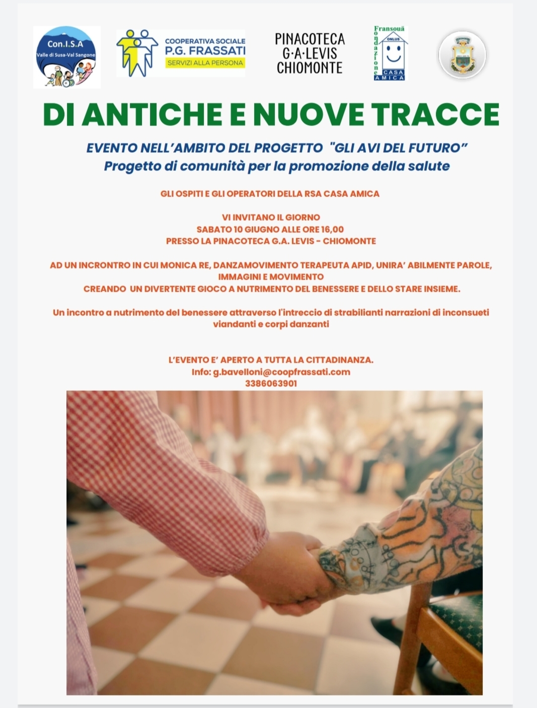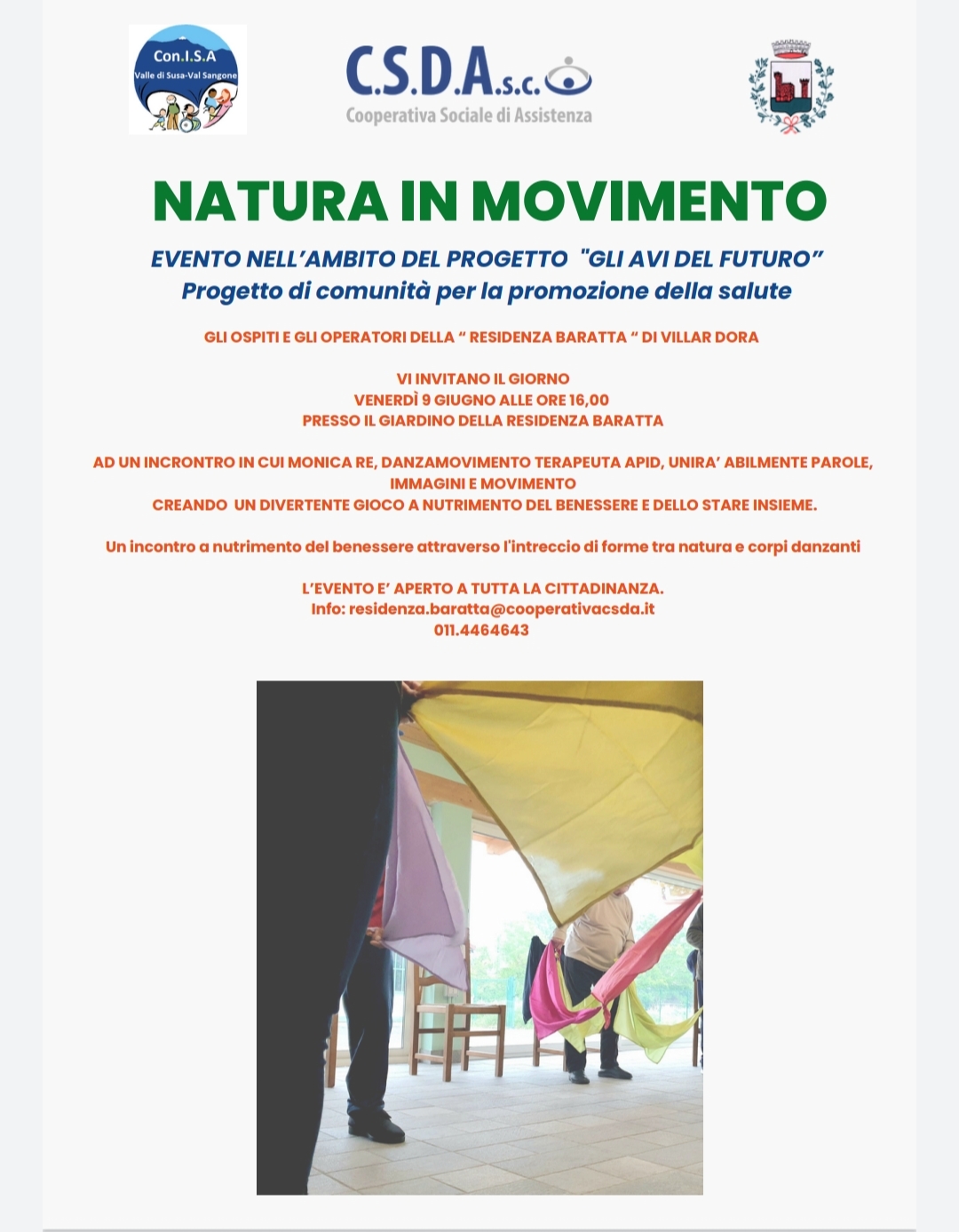 Gli ospiti e gli operatori della RSA Casa Amica di Chiomonte e della Residenza Baratta di Villar Dora vi invitano a partecipare all'incontro in cui Monica Re, danzamovimento terapeuta, unirà parole, immagini e movimento creando un divertente gioco a nutrimento del benessere e dello stare insieme.