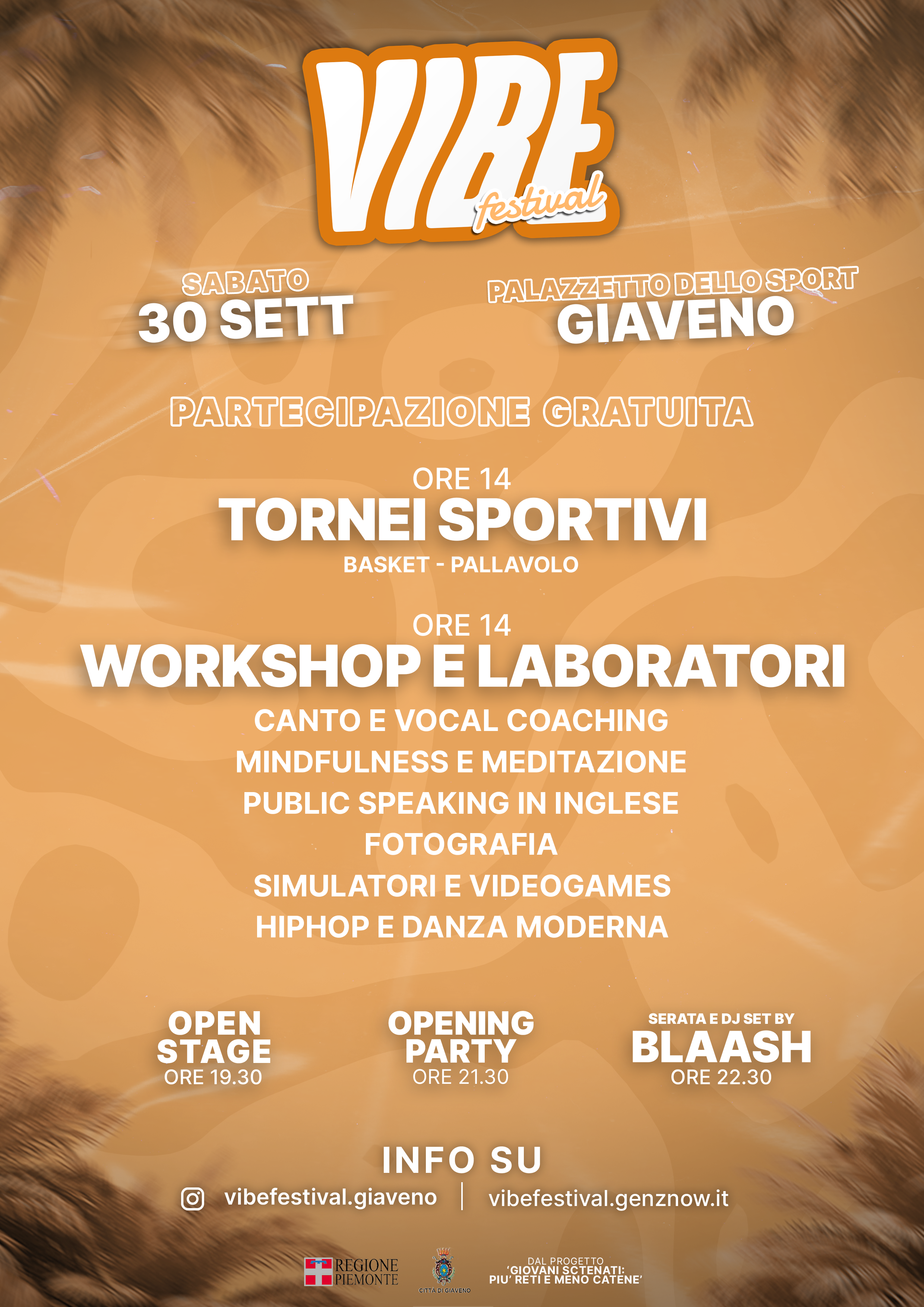 La giornata, che inizia alle 14, si concluderà con Open stage live music di band e cantanti, un Party aperto e serata dj con Blaash. Il Vibe Festival conclude una serie di iniziative che ha coinvolto centinaia di ragazzi e ragazze in Val Sangone e Val Susa, impegnati nei mesi scorsi in cineforum, attività sportive, laboratori.