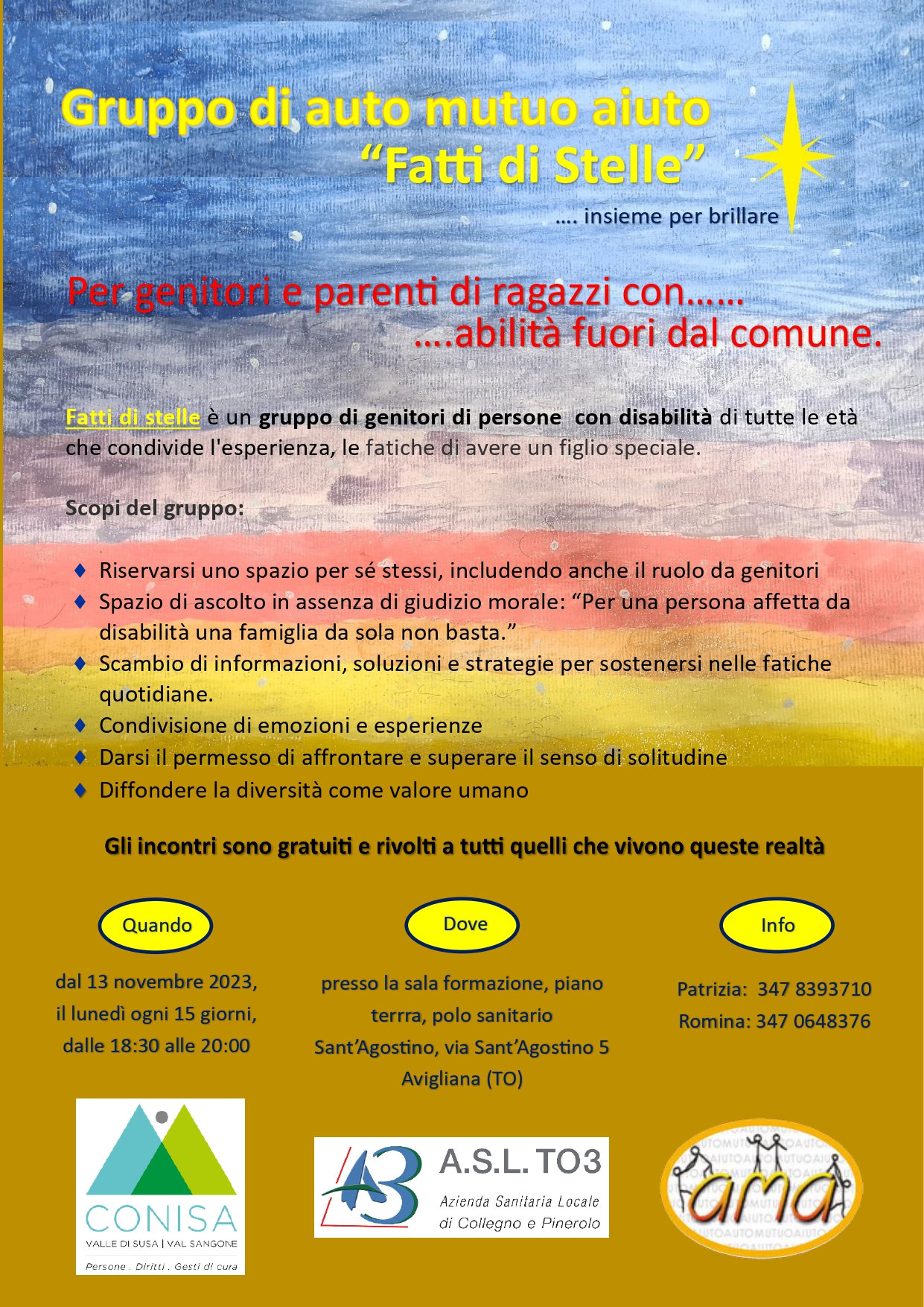 Hanno preso avvio a novembre gli incontri per genitori e parenti di persone con disabilità presso il Polo sanitario di Avigliana Sant'Agostino, i lunedì ogni 15 giorni dalle 18,30 alle 20.00.