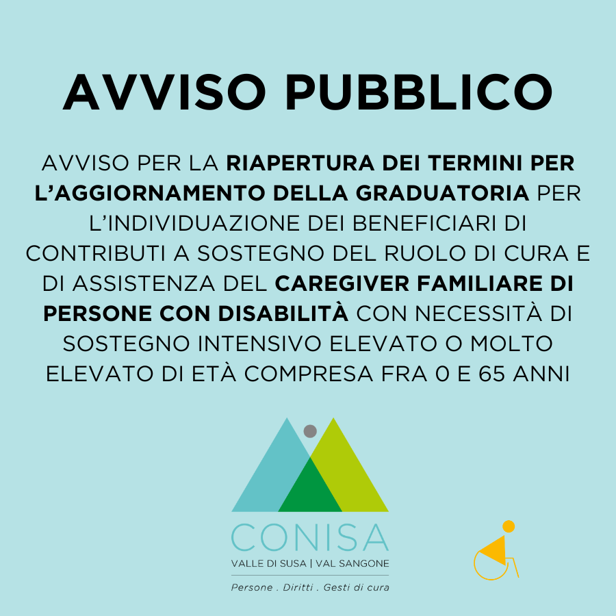 AVVISO PER LA RIAPERTURA DEI TERMINI PER L’AGGIORNAMENTO DELLA GRADUATORIA PER L’INDIVIDUAZIONE DEI BENEFICIARI DI CONTRIBUTI A SOSTEGNO DEL RUOLO DI CURA E DI ASSISTENZA DEL CAREGIVER FAMILIARE DI PERSONE CON DISABILITÀ CON NECESSITÀ DI SOSTEGNO INTENSIVO ELEVATO O MOLTO ELEVATO DI ETÀ COMPRESA FRA 0 E 65 ANNI