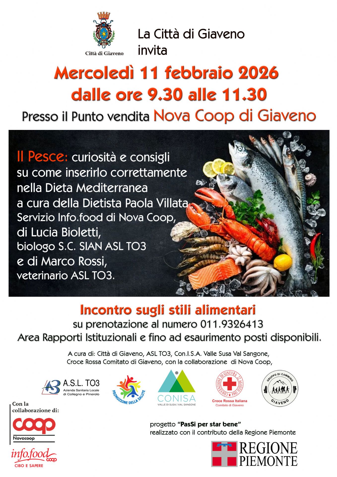 Mercoledì 11 febbraio 2026 dalle 9.30 – 11.30 presso la Nova Coop di Giaveno è in programma l'incontro sugli stili alimentari organizzato dalla Città di Giaveno.