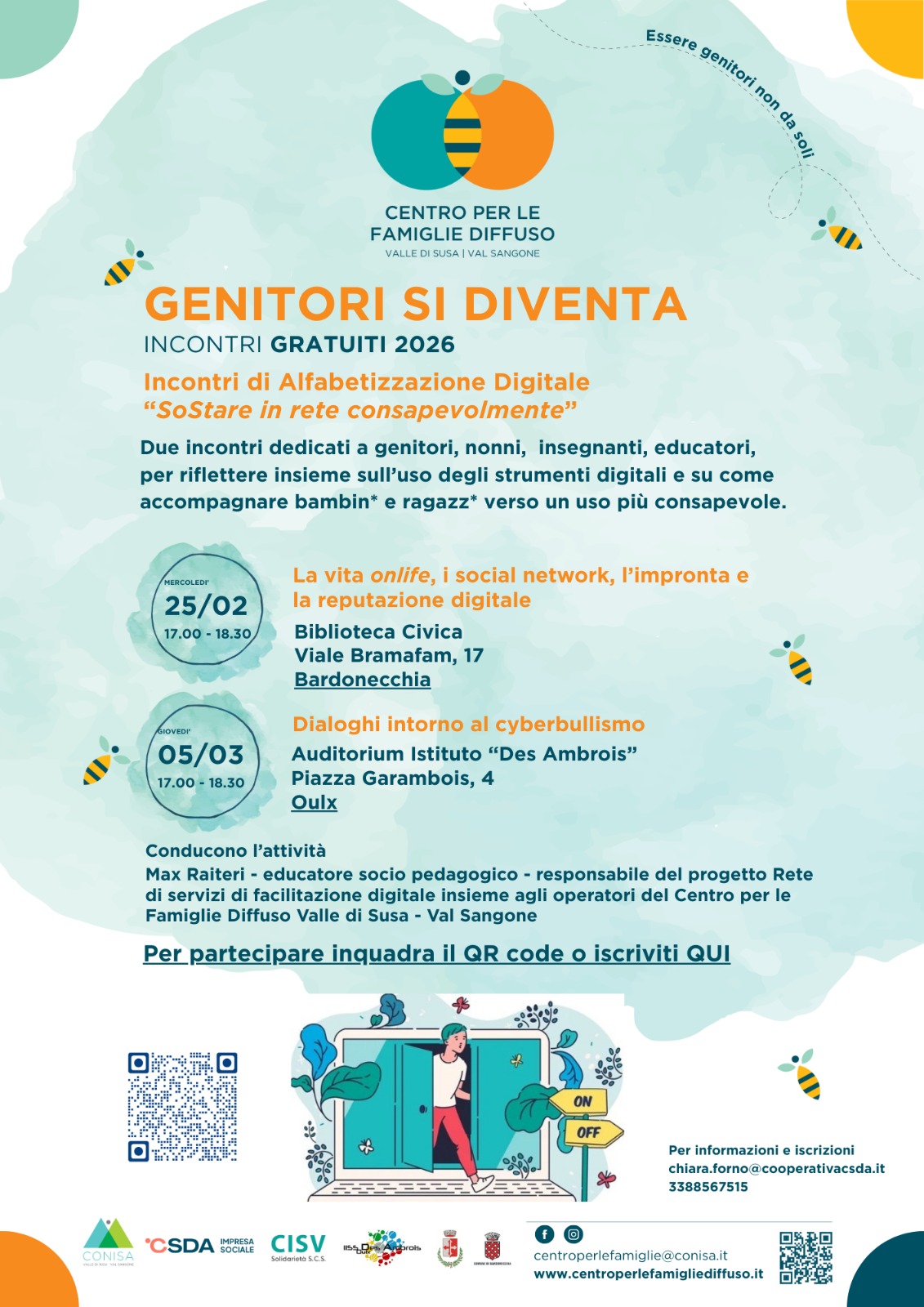 Il Centro per le Famiglie Diffuso Valle di Susa e Val Sangone propone 𝐝𝐮𝐞 𝐢𝐧𝐜𝐨𝐧𝐭𝐫𝐢 𝐠𝐫𝐚𝐭𝐮𝐢𝐭𝐢 𝟐𝟎𝟐𝟔 di 𝐚𝐥𝐟𝐚𝐛𝐞𝐭𝐢𝐳𝐳𝐚𝐳𝐢𝐨𝐧𝐞 𝐝𝐢𝐠𝐢𝐭𝐚𝐥𝐞 dedicati a 𝒈𝒆𝒏𝒊𝒕𝒐𝒓𝒊, 𝒏𝒐𝒏𝒏𝒊, 𝒊𝒏𝒔𝒆𝒈𝒏𝒂𝒏𝒕𝒊 𝒆𝒅 𝒆𝒅𝒖𝒄𝒂𝒕𝒐𝒓𝒊.