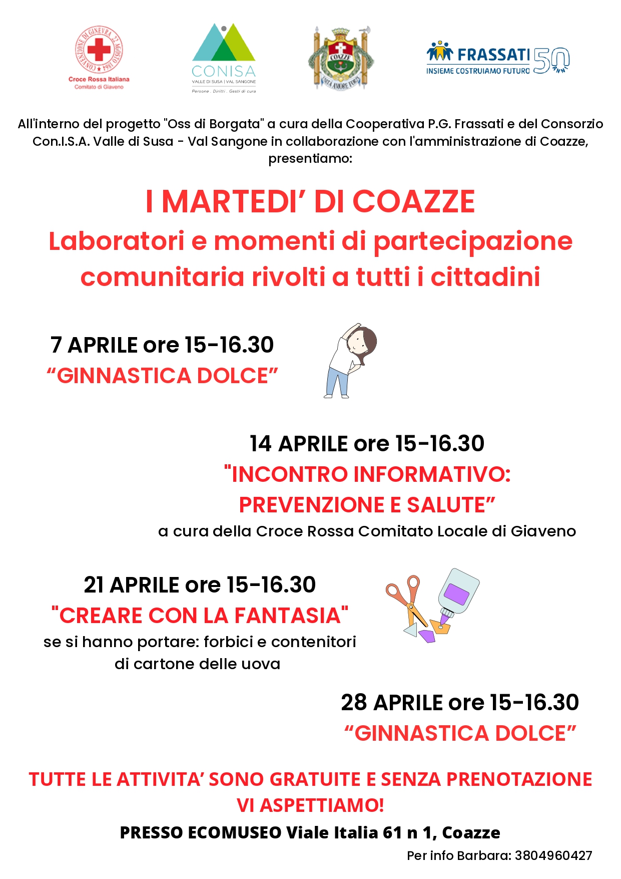 All'interno del progetto "Oss di Borgata", a cura della Cooperativa P.G. Frassati e del Consorzio Con.I.S.A. Valle di Susa - Val Sangone, in collaborazione con il Comune di Coazze, vi aspettiamo per un ciclo di incontri dedicati al benessere, alla creatività e alla socialità 💛