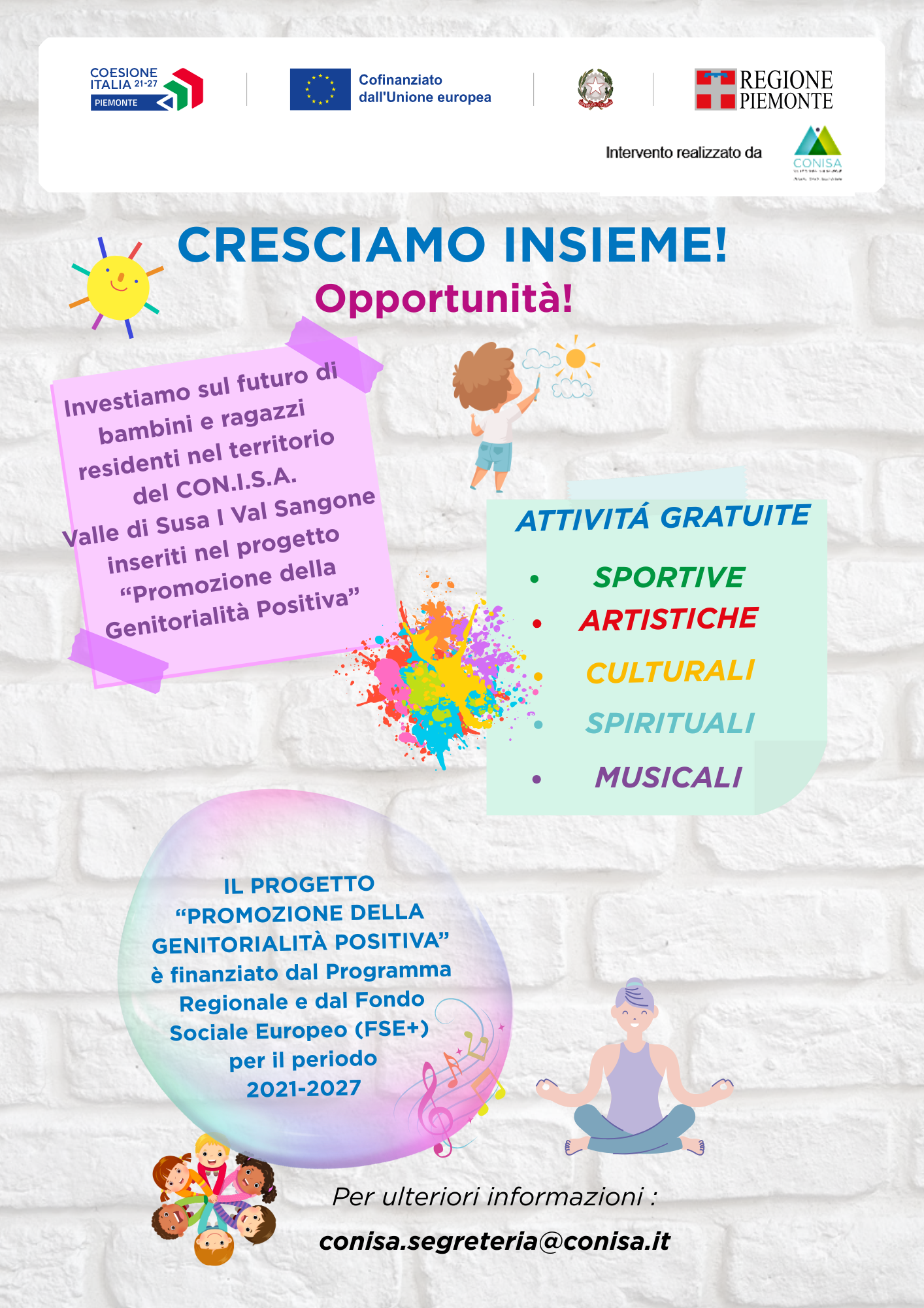 Il progetto, finanziato dalla Regione Piemonte tramite il Fondo Sociale Europeo Plus 2021-2027 (PR FSE+ 2021-2027, ha l’obiettivo di favorire l’accesso dei minori già coinvolti nel progetto “Promozione Genitorialità Positiva” ad “Opportunità” di carattere sportivo, artistico, musicale, culturale, ricreativo e spirituale.
